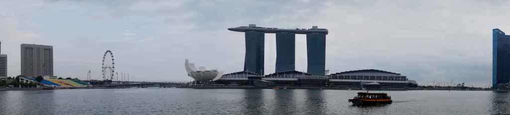 On the left is the Singapore Flyer. To the right, the lotus/clasped-hands shaped building is the ArtScience Museum followed by the Marina Bay Sands Resort (the 3 tall buildings with a slug on top), the curved building in front of Marina Bay Sands Resort is The Shoppes at Marina Bay Sands (I didn’t type Shoppes wrong, that’s how it’s spelt. Also it was designed based off the shape of a DNA strand) and in front is a boat….a very ordinary looking boat.