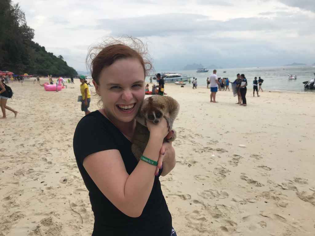 We made our way to Naka Island, the final island in our day trip. After jumping off the boat and onto the sand we were greeted by one of the cutest animals we’ve seen. After a quick Google search it looks like this was a Slow Loris monkey. As you can tell Chantal was super happy to meet this beautiful animal.