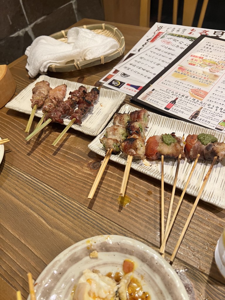 Once we had walked around enough to get hungry again, we set out to find something to eat. We found a place called Niiya which specialises in yakitori (meat on a stick). The menu was completely in Japanese with no pictures and there were no Westerners to be seen – an excellent sign. We managed to order some Sake and various meats, most of which were delicious.