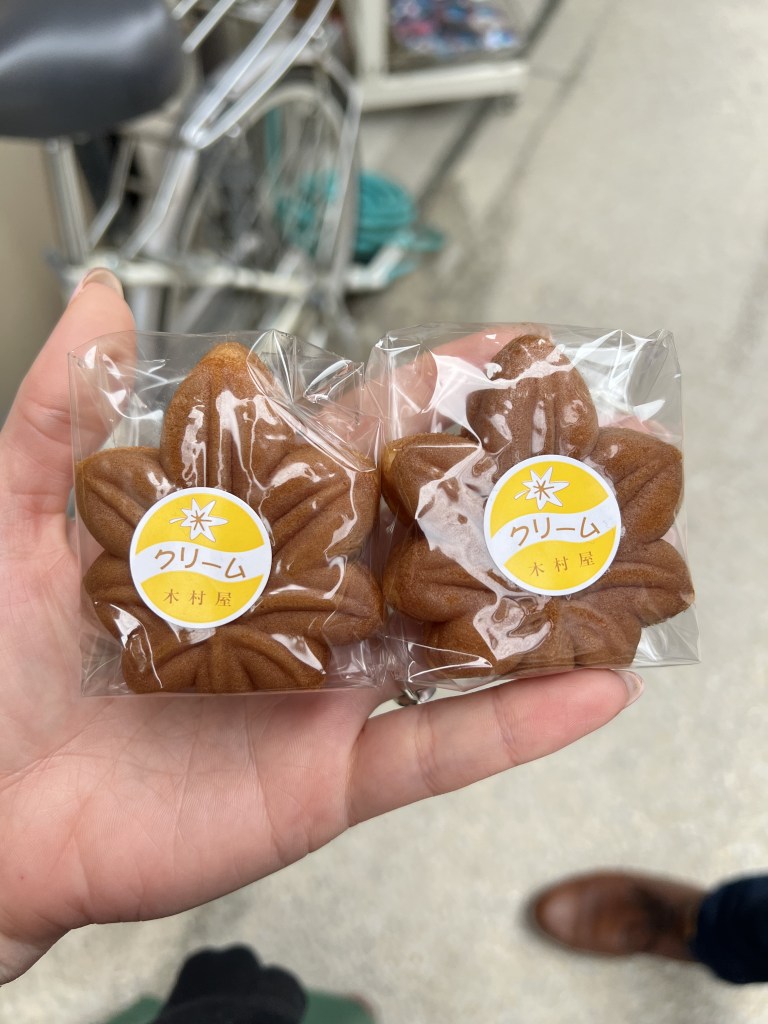 We walked through the main streets full of food and souvenir stalls before stopping at one for a quick snack. We didn’t get a photo at the time but here’s one of Chris holding another one he later purchased. The stall vendor taught us the Japanese word for delicious – “Oishī”. When we went back to grab our second helping, he remembered us and made sure we had a fresh, warm “Miyajima croissant”.